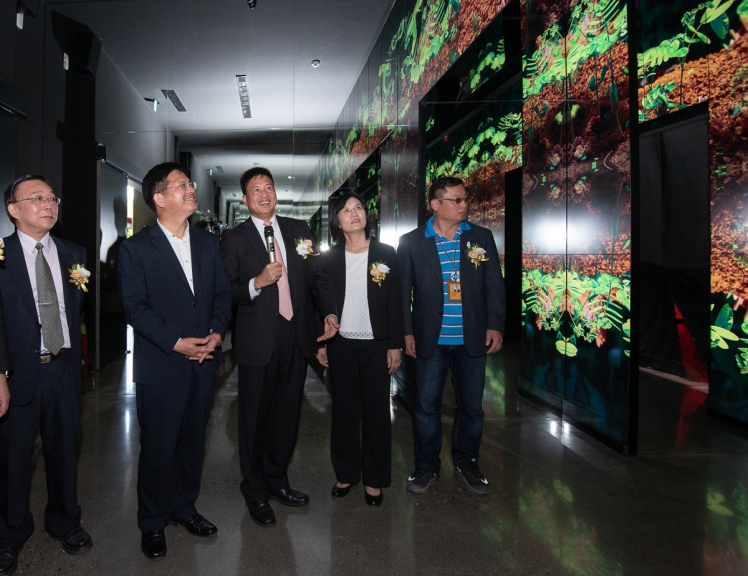 友達微美館以大自然實景拍攝結合電腦動畫的壯闊影片,讓觀眾仿佛身歷其境感受植物的生命旅程 (左一:國立臺灣博物館館長洪世佑、左二:臺中市市長林佳龍、左三:友達光電董事長暨執行長彭双浪)
